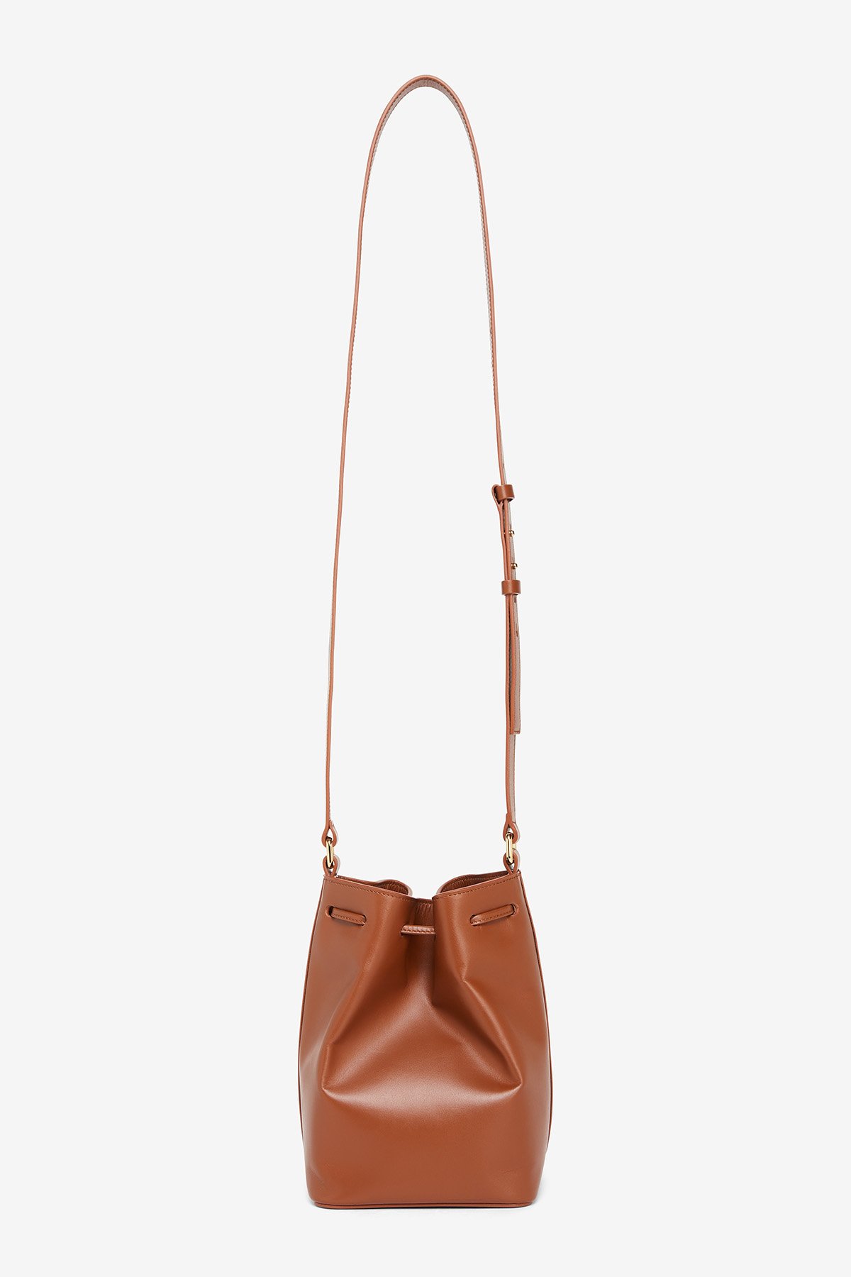 100% Leather bucket bag with shoulder strap and 100% cotton lining. 16X23X14 cm