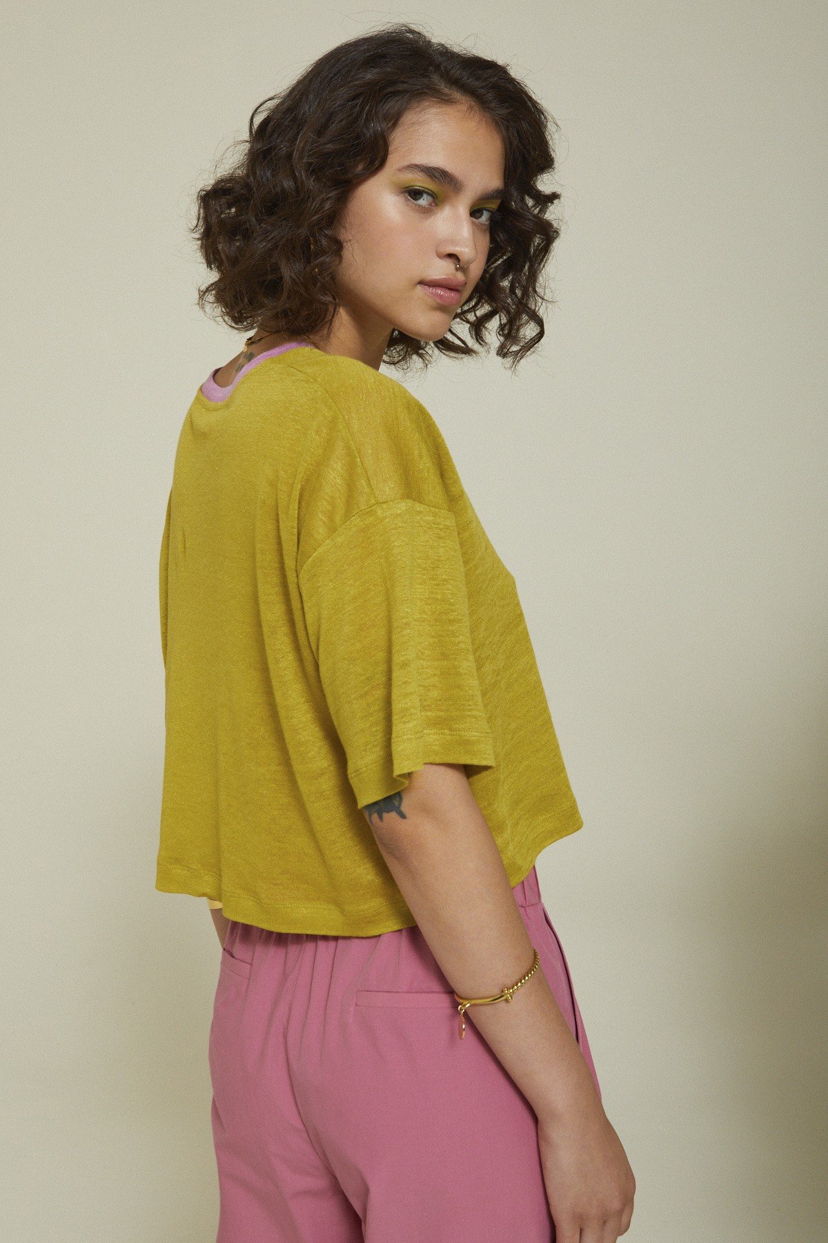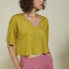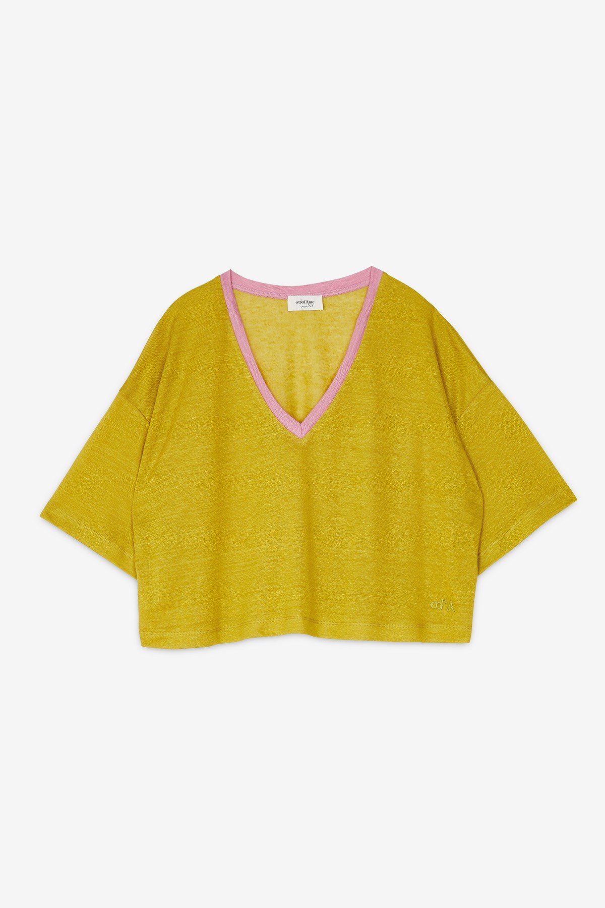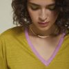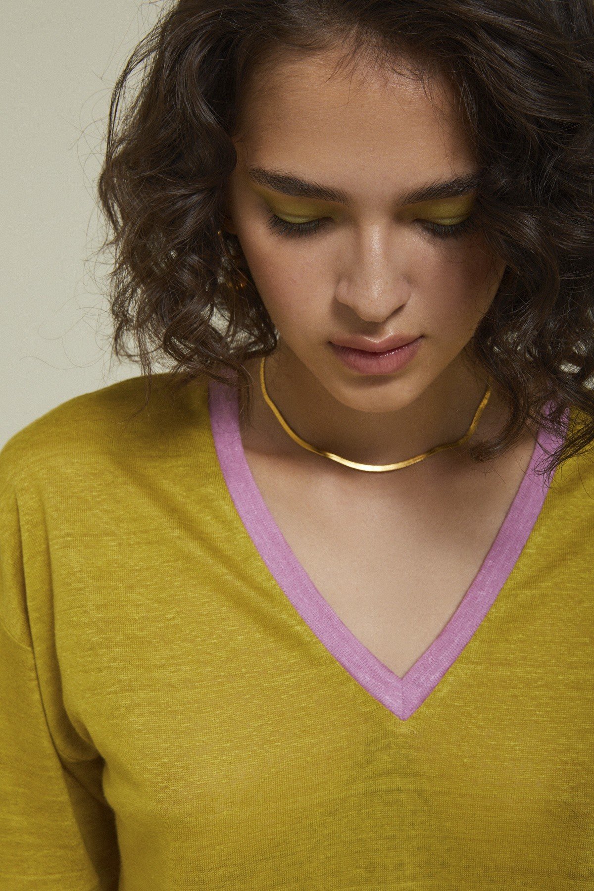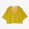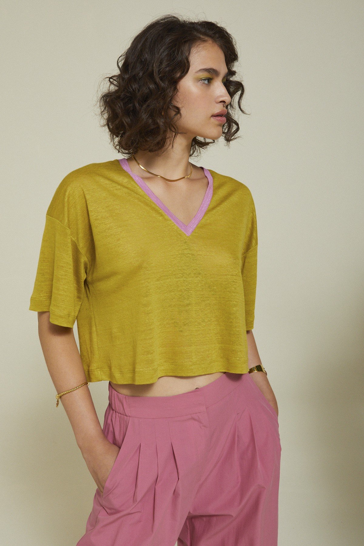 100% Linen sweater with V-neck and contrasting trim.